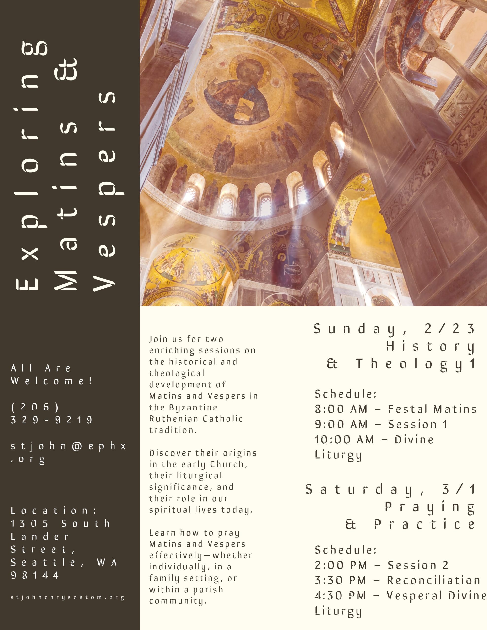 Join us for an enriching session on the historical and theological development of Matins and Vespers in the Byzantine Ruthenian Catholic tradition. Discover their origins in the early Church, their liturgical significance, and their role in our spiritual lives today.